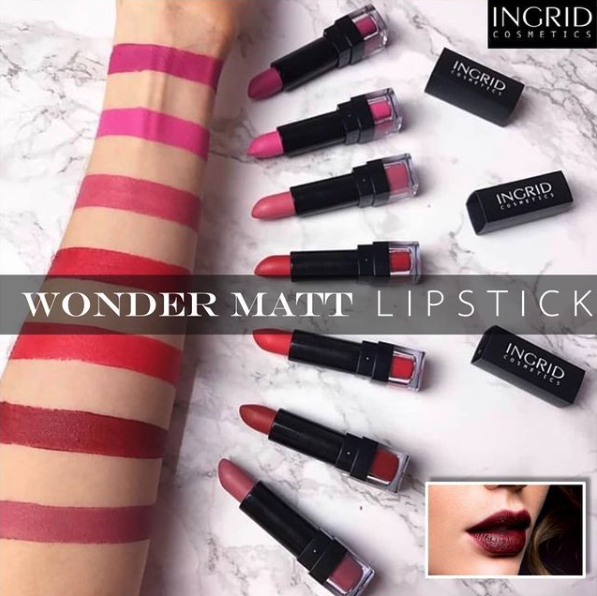 INGRID Lipstick Wonder Matt provides an intense and extremely long-lasting color and velvety, matte finish of make up. The modern formula enriched with macadamia oil protects and moisturizes so you can get the effect of matte lips without lifting up the peels. Light, creamy texture perfectly spreads ensuring even coverage. Available in 9 top shades.